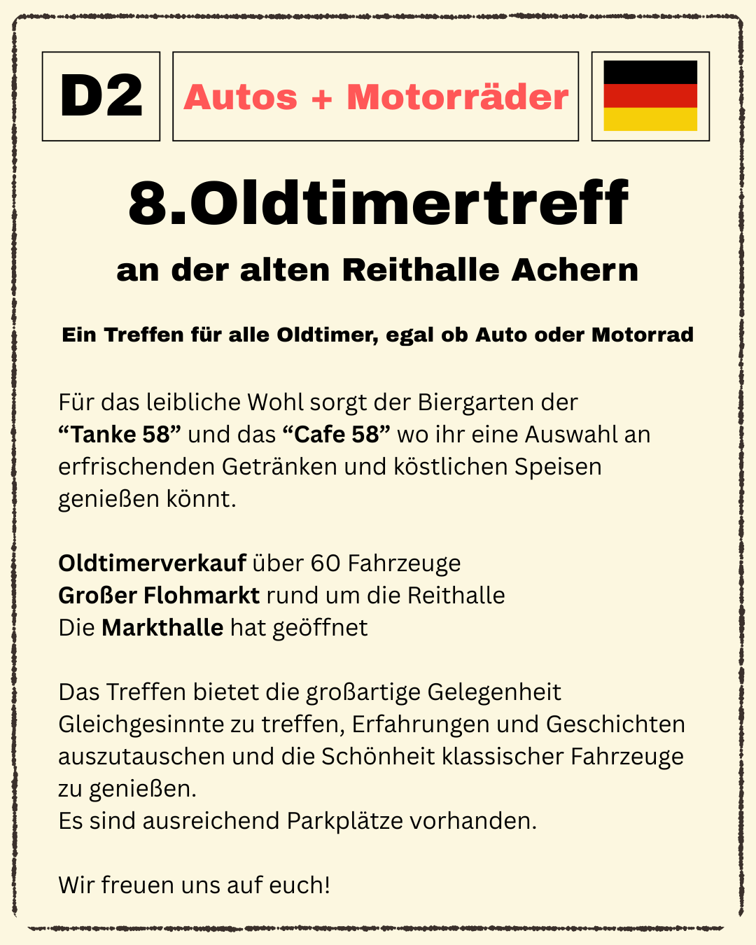 Am 1. Mai 2026 findet zum 8. Mal das Oldtimertreffen an der Reithalle statt.